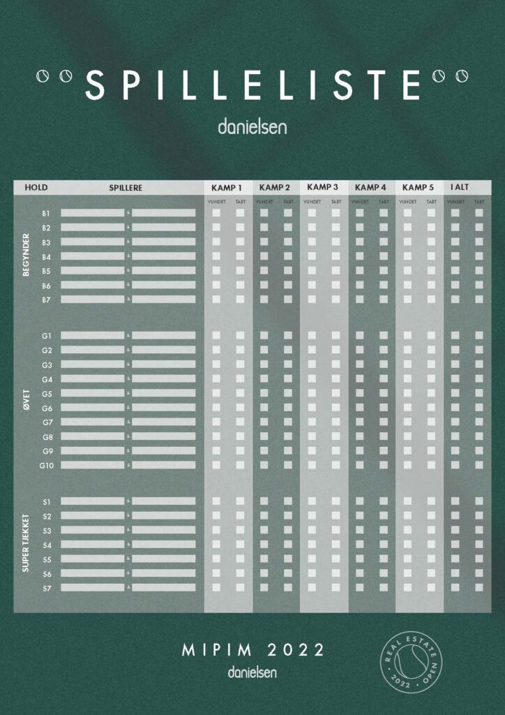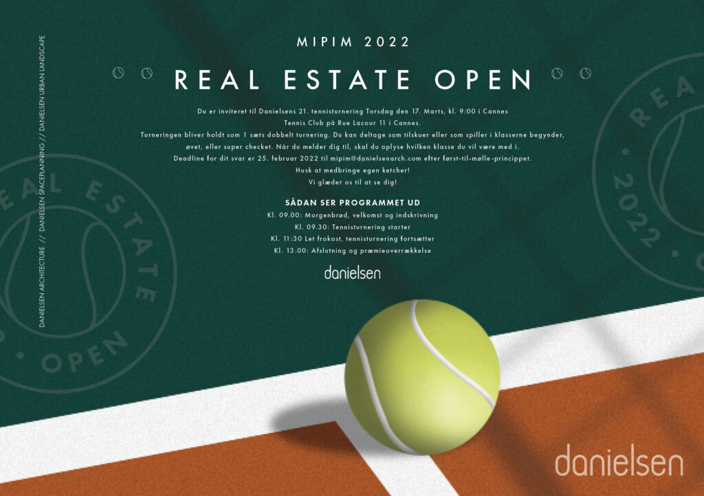 MIPIM Real Estate Open er en årlig tennisturnering i Cannes som Danielsen arrangerer. Jeg fik til opgave at designe en ny og mere indbydende invitation, design af spilleliste, banner, polo og et opslag til LinkedIn. samt redesigne selve logoet.
